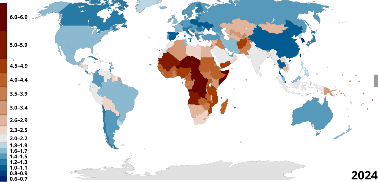 Africa isn’t suffering from the self-strangulation of collapsing birthrates that are smiting more “developed” countries either. A map of global fertility rates clearly shows where the future of the world lies (blue indicates negative birth rates, while red indicates positive birth rates).
